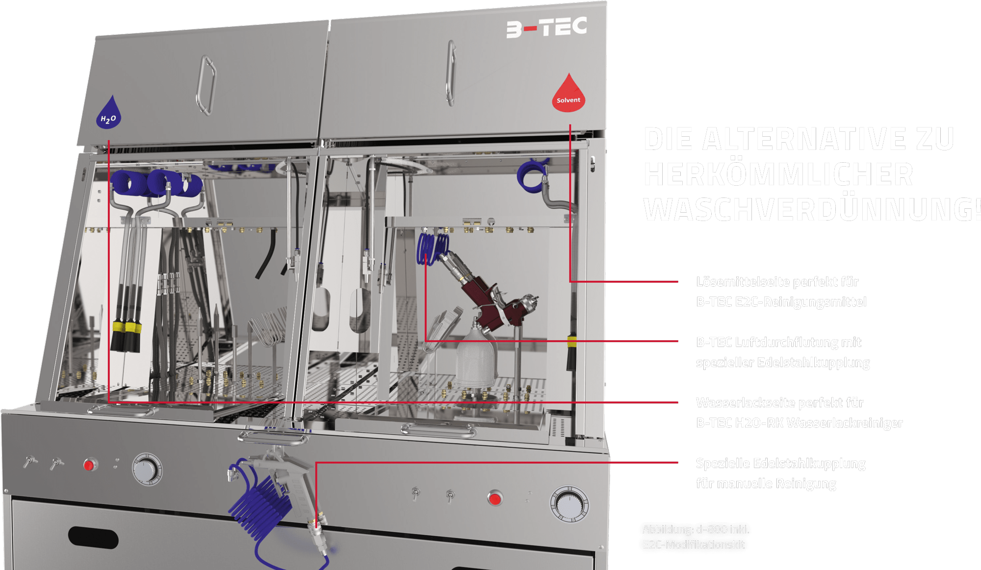 Bei Einsatz beider Lackarten können in den B-TEC Waschgerätekombinationen d-800 und SUMO die beiden Reinigungsmittel B-TEC E2C für Lösemittel und B-TEC H2O-RK für Wasserlacke miteinander kombiniert werden. Durch die Trennung von lösemittel- und wasserbasierten Lacken geht man nicht nur keine Kompromisse bei der Reinigungsleistung ein, sondern erreicht auch ein kostengünstigeres Gesamtkonzept für die Reinigung der Lackierpistolen.