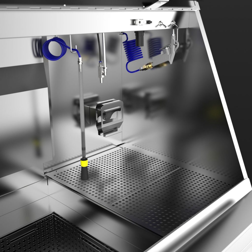 - manuelle Reinigungsstation mit pumpenbetriebenem und druckregulierbarem Durchlaufpinsel