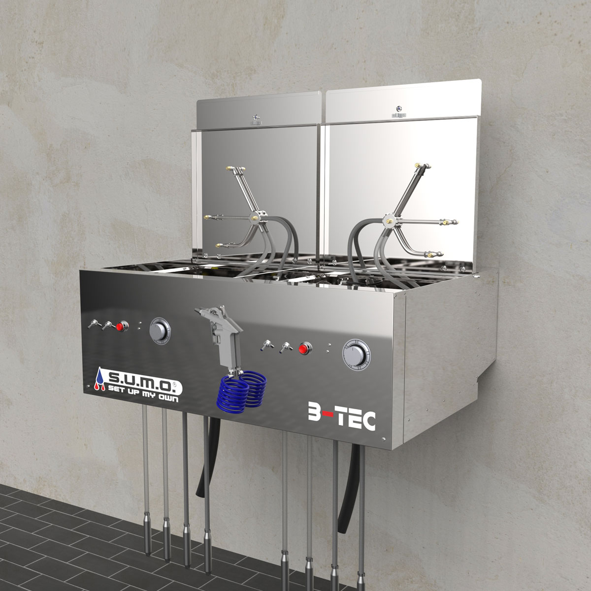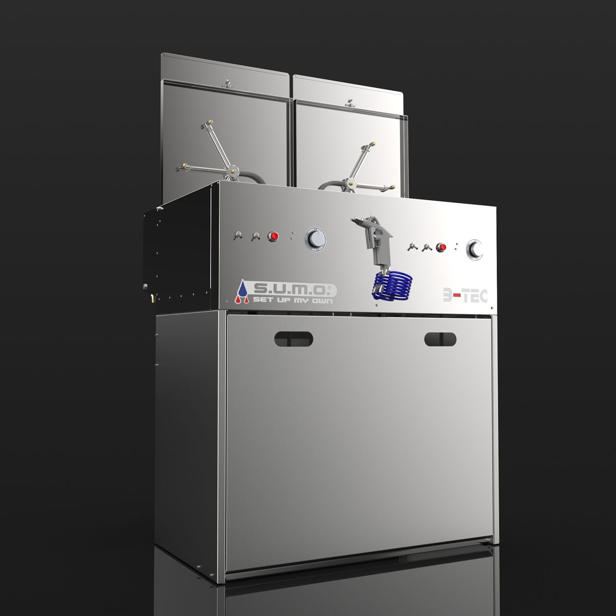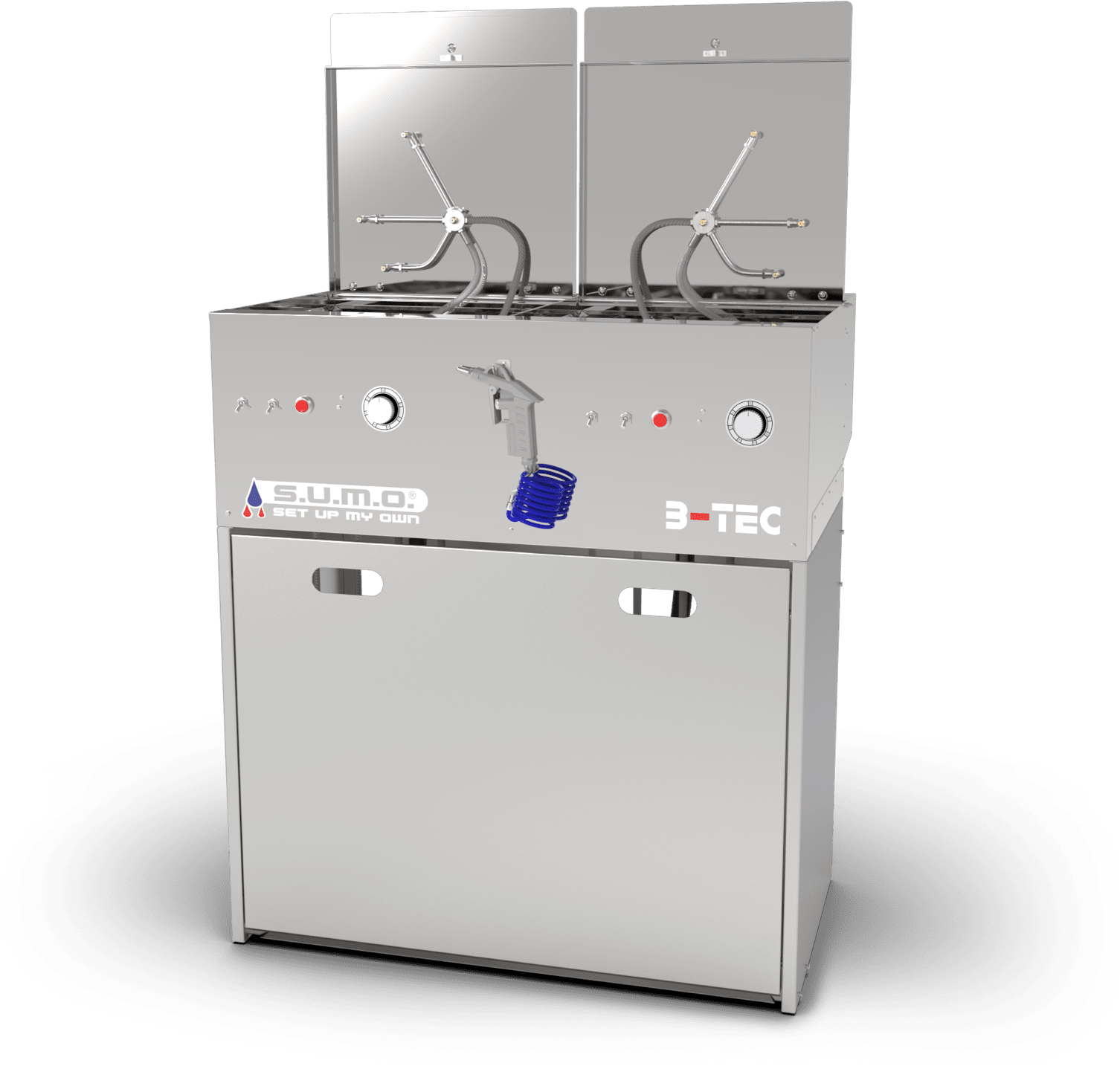 Das Basismodul des S.U.M.O. besteht aus zwei kompakten, unabhängigen Waschräumen, der vertraut starken B-TEC Absaugung für beide Geräteseiten sowie einer universellen Aus- und Abblaspistole.