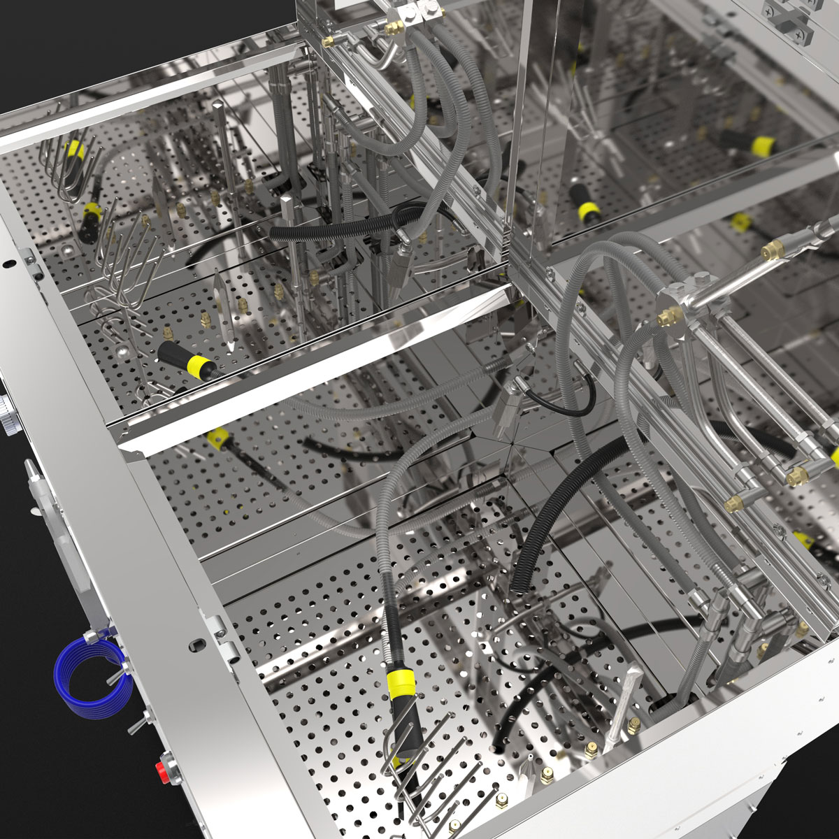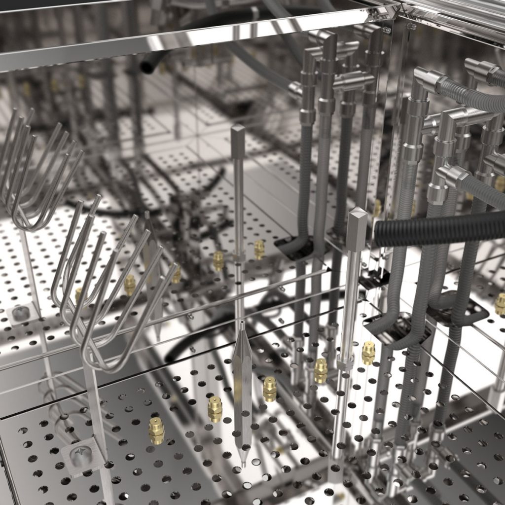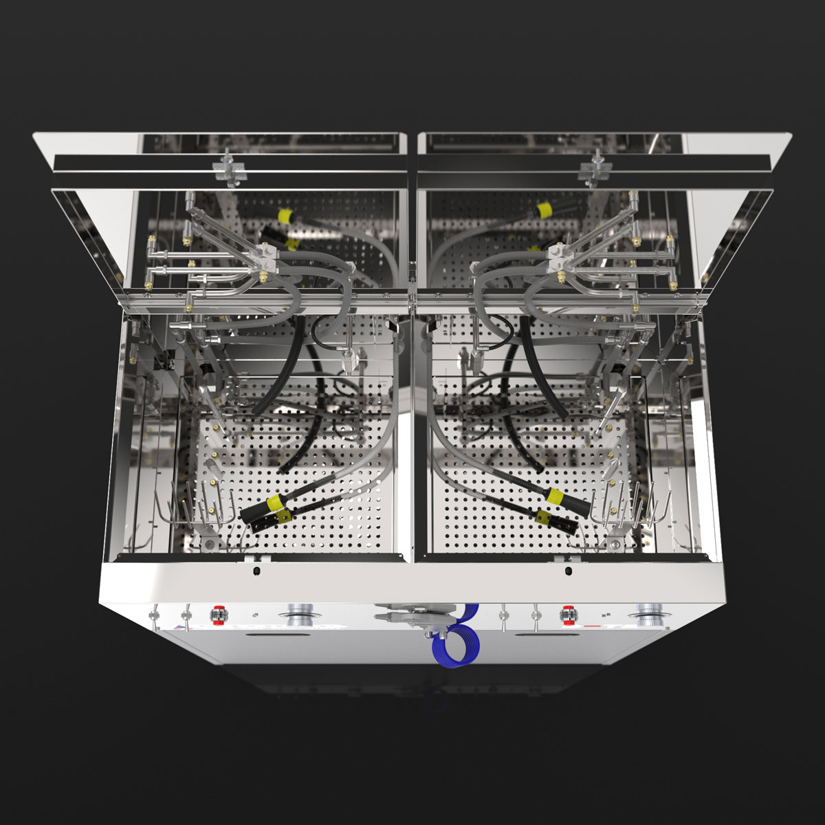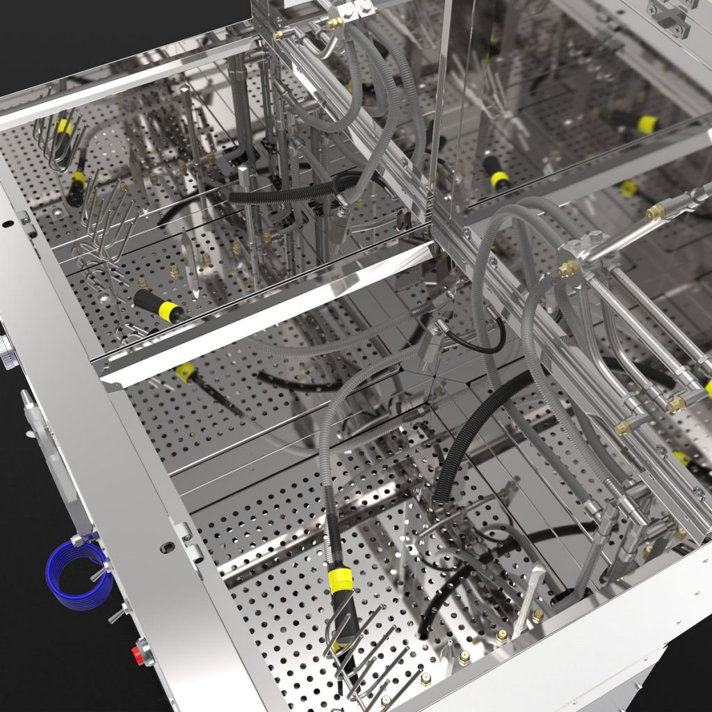 Das Waschgerät besteht aus zwei unabhängigen Waschräumen, die wahlweise mit Lösemittel / B-TEC E2C, wässrigen Reinigern oder jeweils mit einem anderen Reinigungsmedium eingesetzt werden können.