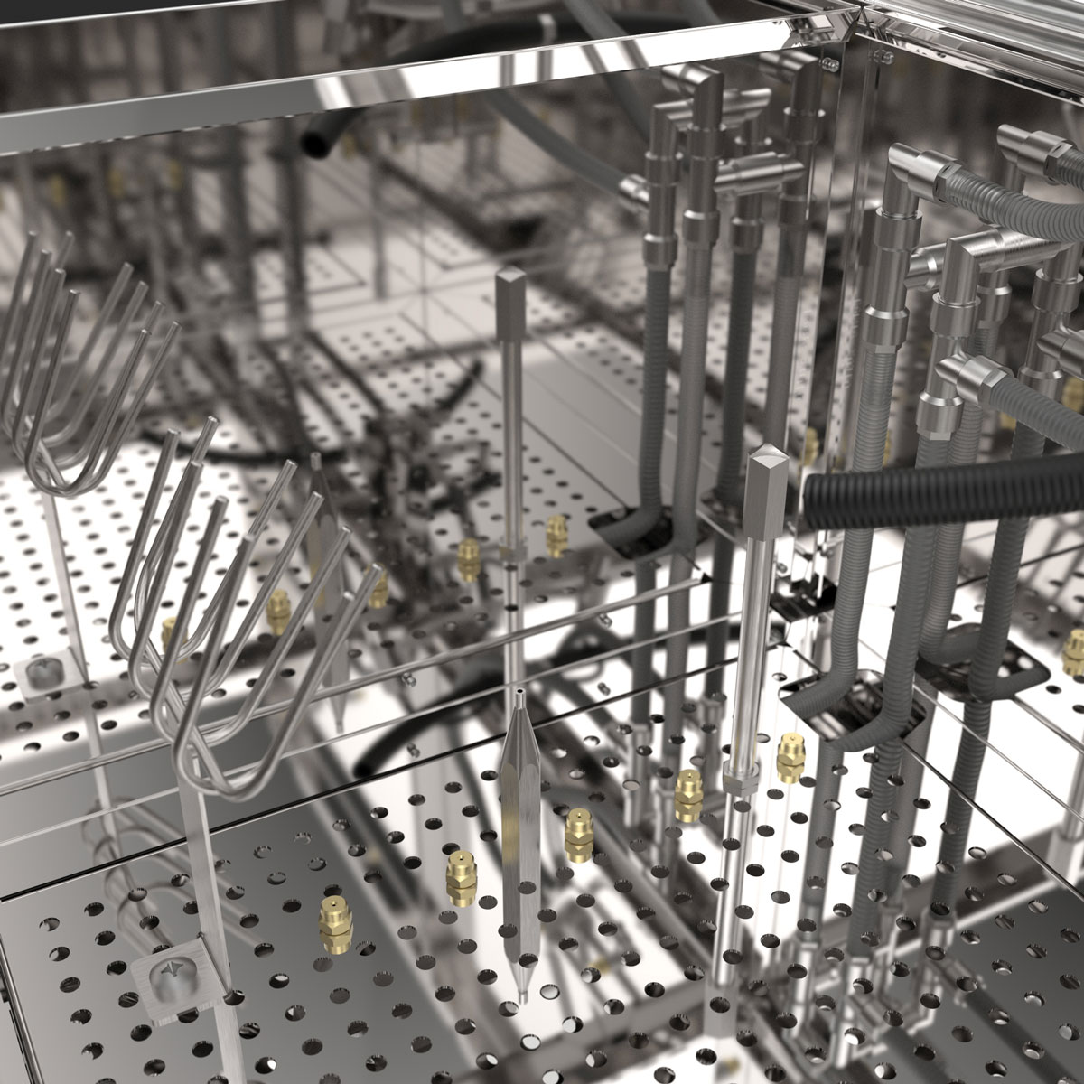 Heller Waschbereich aus rostfreiem Edelstahl und Messingdüsen. Kein Einsatz von lichtabsorbierendem Kunststoff.