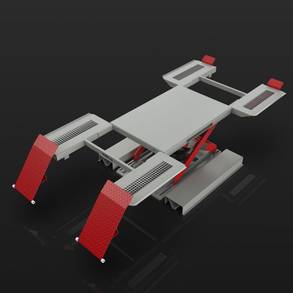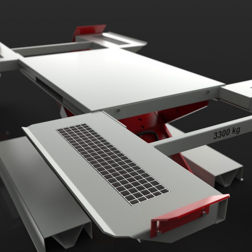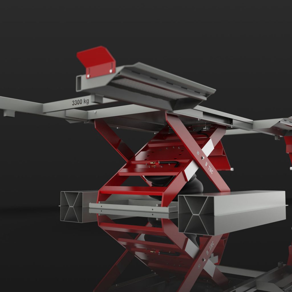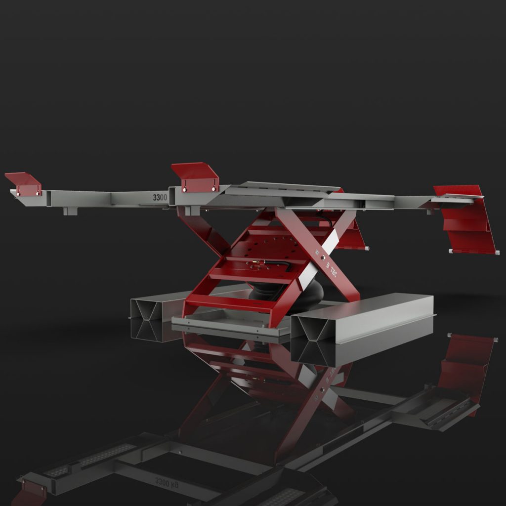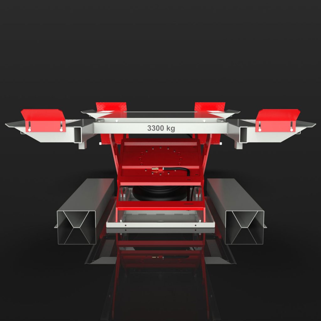 Pneumatic lift for lifting vehicles standing on wheels with 3.3 tonnes lifting capacity – surface mounted or as in-ground version.