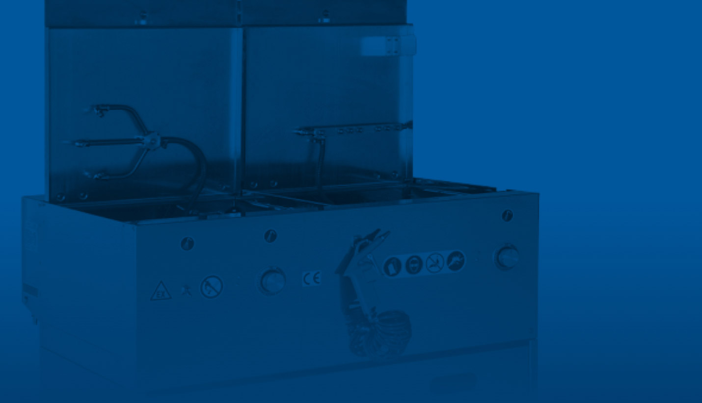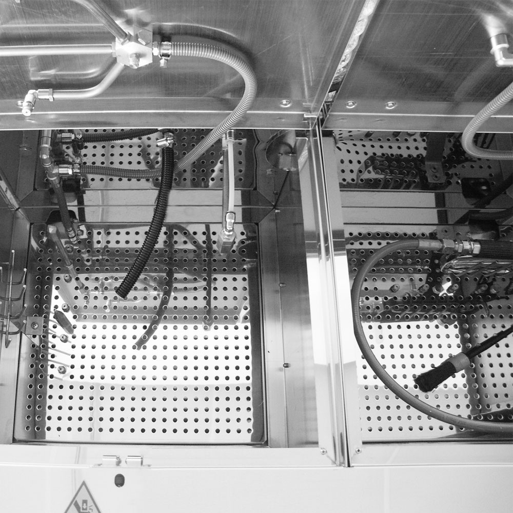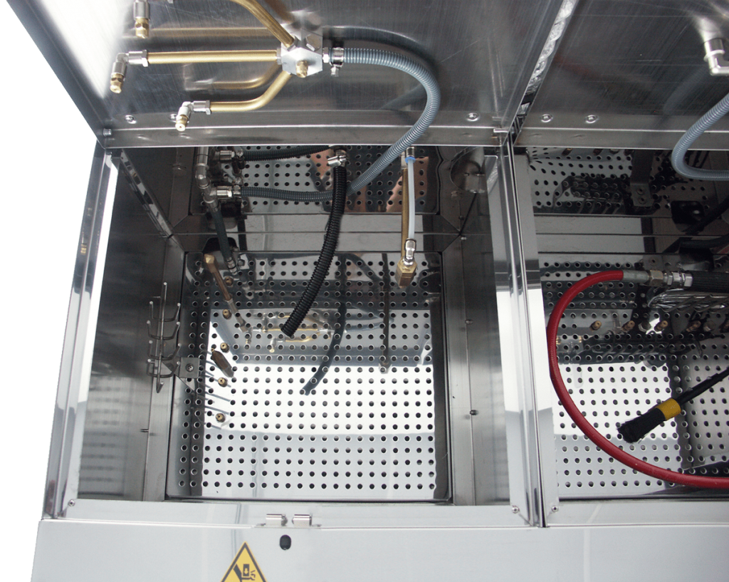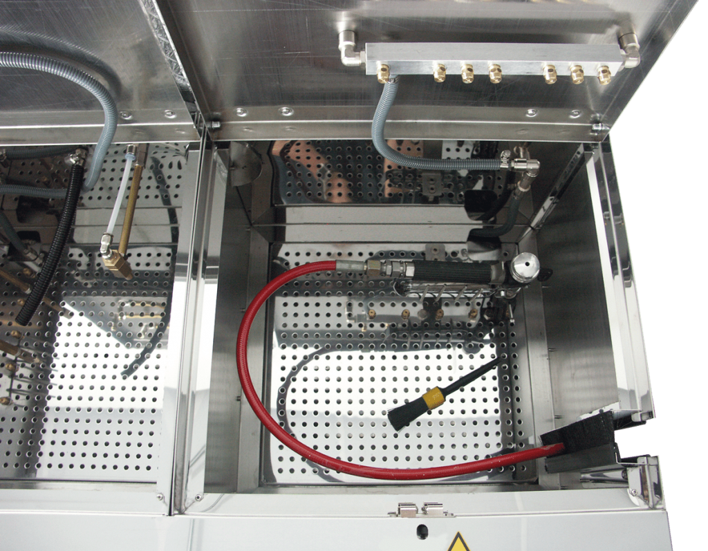 On the left-hand side of the washer, the gravity gun is cleaned automatically by a timer and 10 spray nozzles.