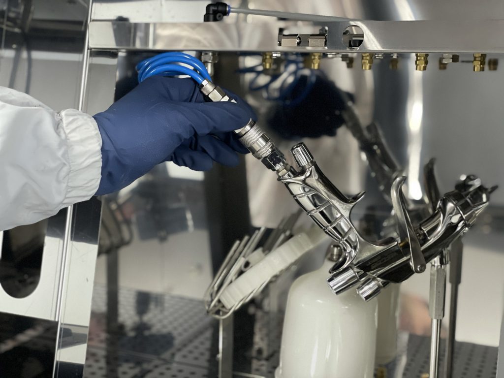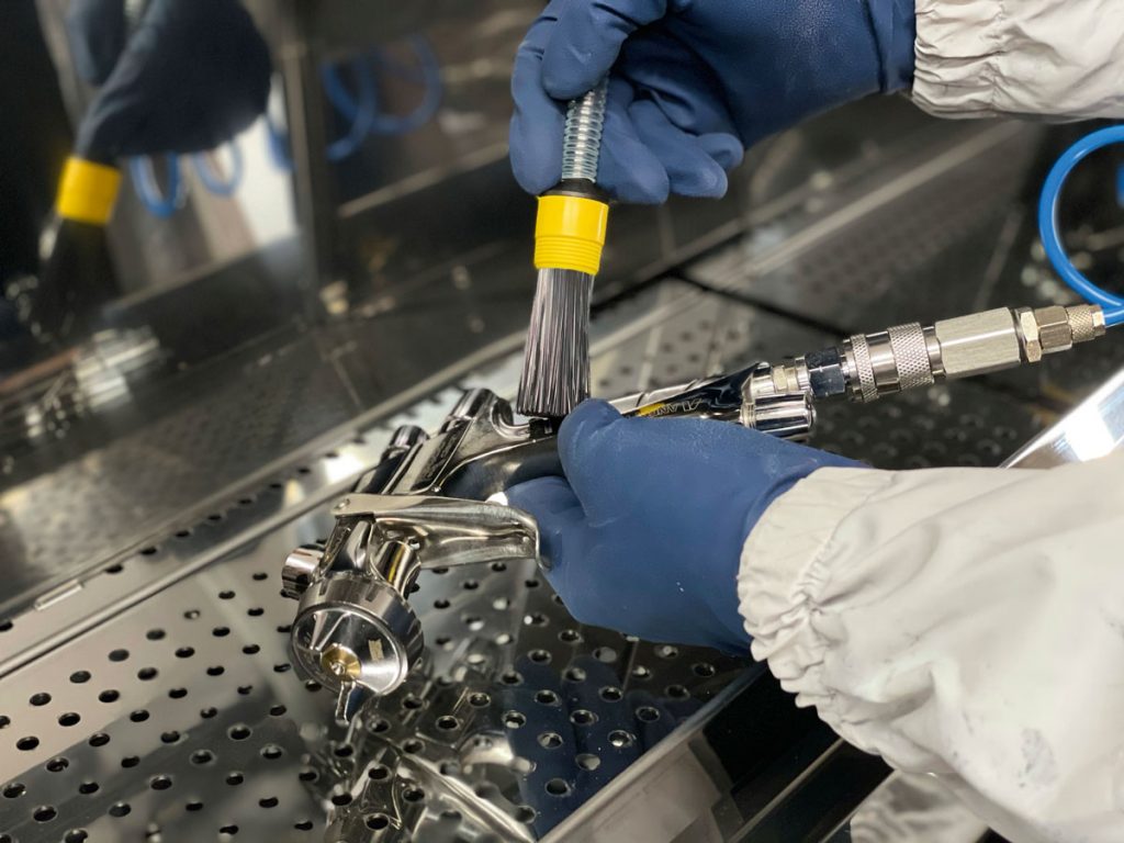 Therefore, the air channels of the spray gun must be particularly well protected during the automatic and manual cleaning process – it is essential to prevent cleaning agents from entering the air channels.