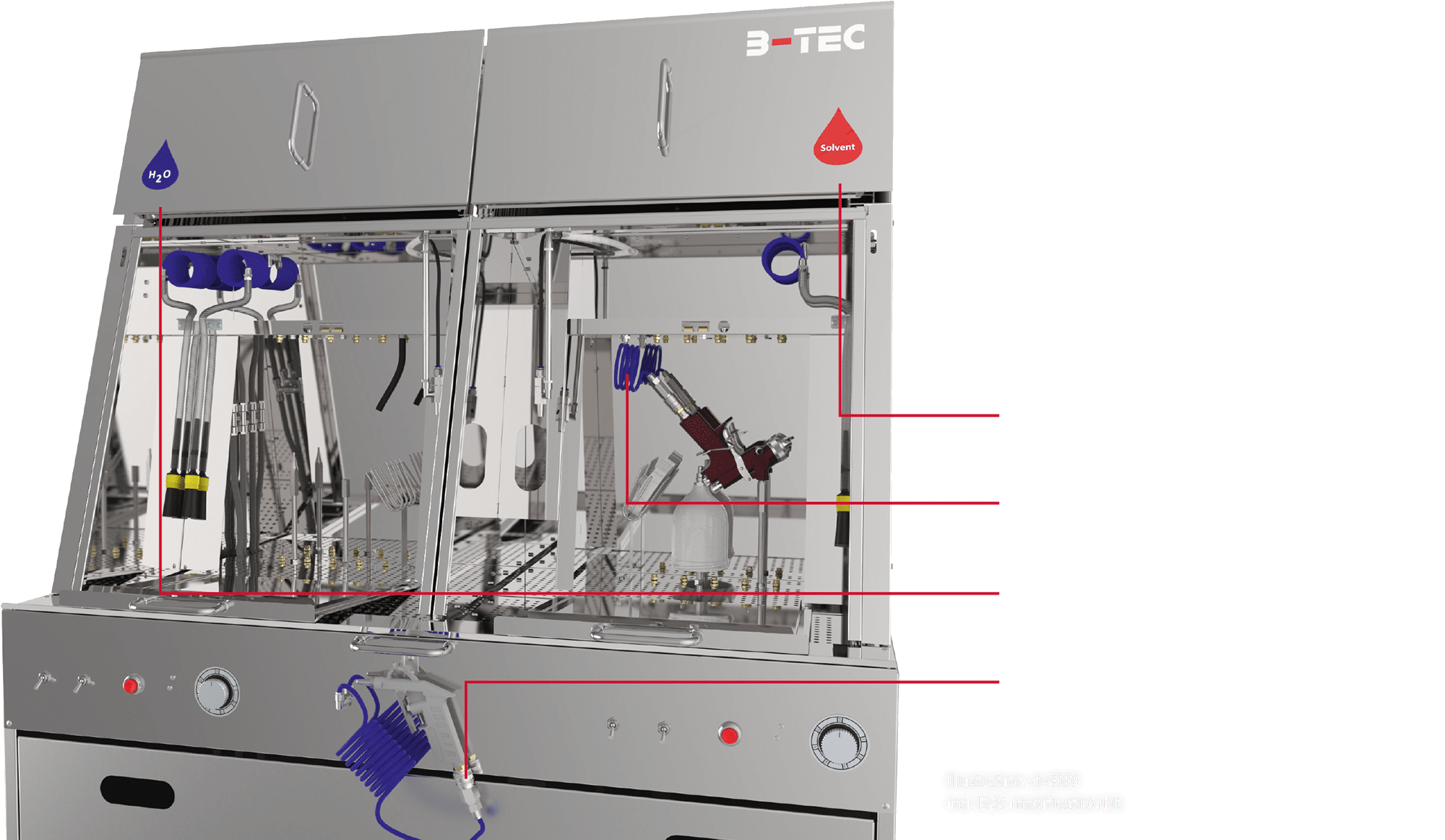 On the water-based paint side of the B-TEC washers, the B-TEC H2O-RK can be used to automatically and manually clean even dried water-based paints effortlessly within a very short time. At the same time, automatic and manual cleaning of the filler or clearcoat gun on the solvent side is possible with B-TEC E2C.