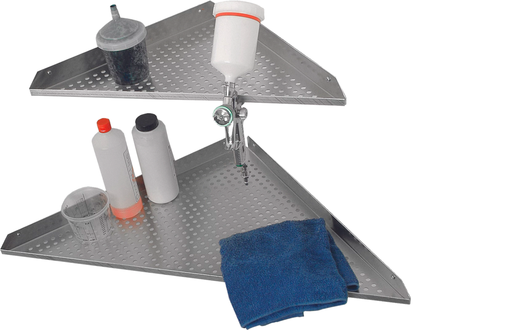 The corner shelves EA 500 (500 mm leg length) and EA 700 (700 mm leg length) offer safe storage possibilities within the spray booth.