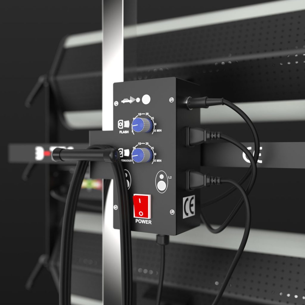 Like all B-TEC IR dryers (exceopt for IR-X), the IR-B02 also features 2-stage drying (flashlight / continuous drying) to heat the coating gently from the inside to the outside, thus preventing coating problems such as “boiling” and “biting”.
