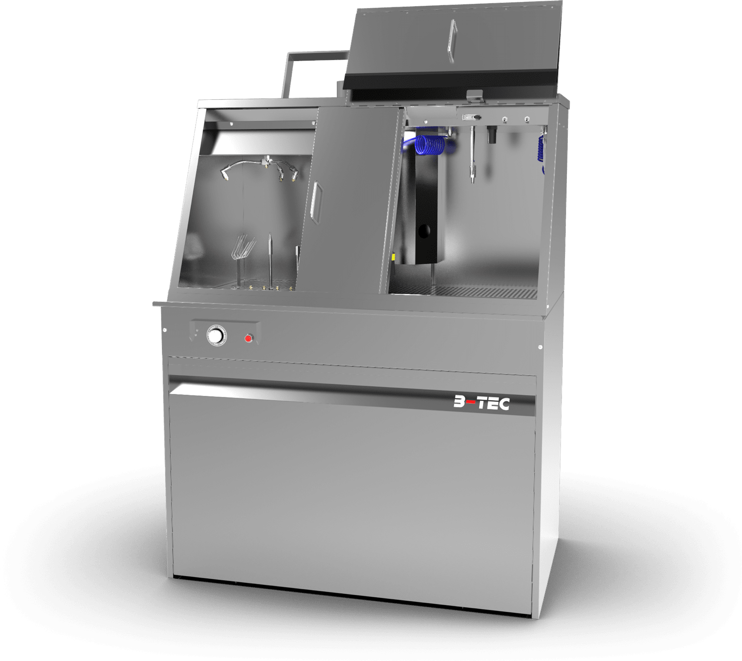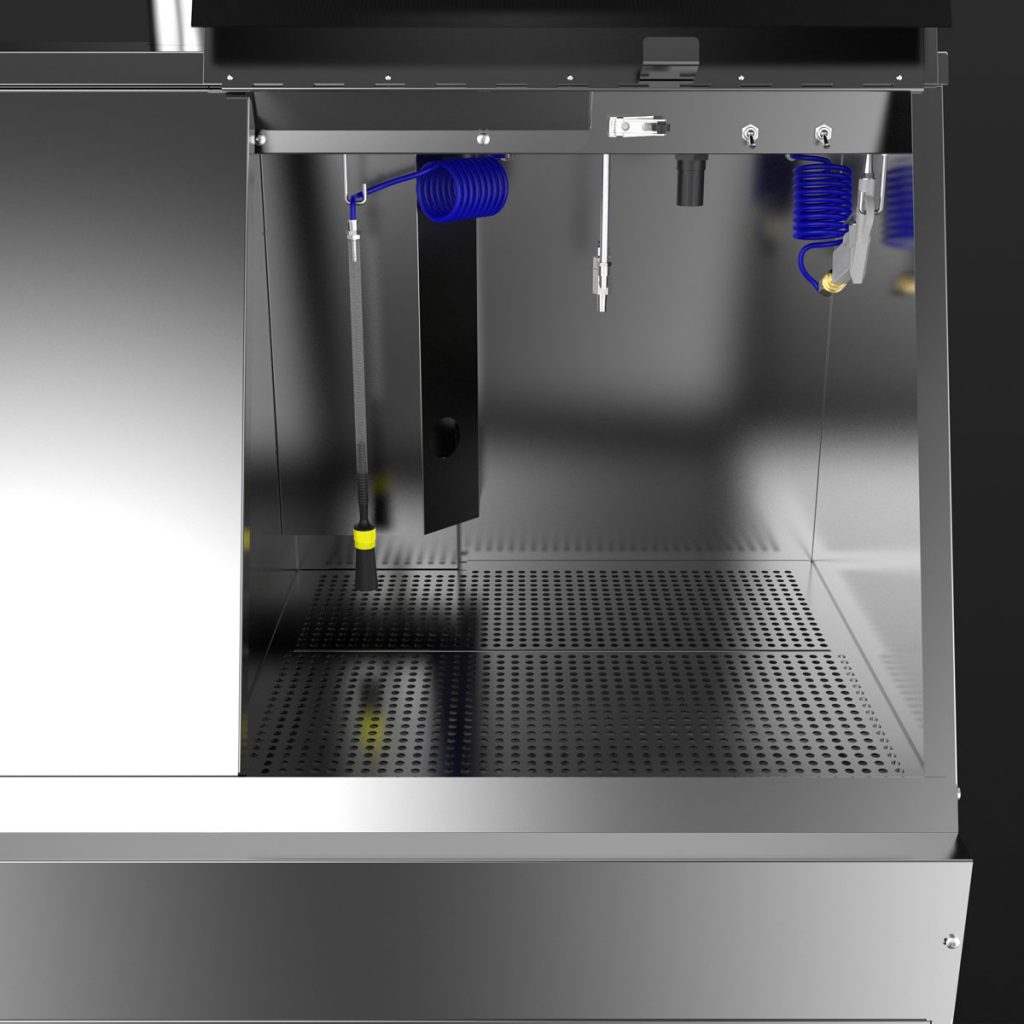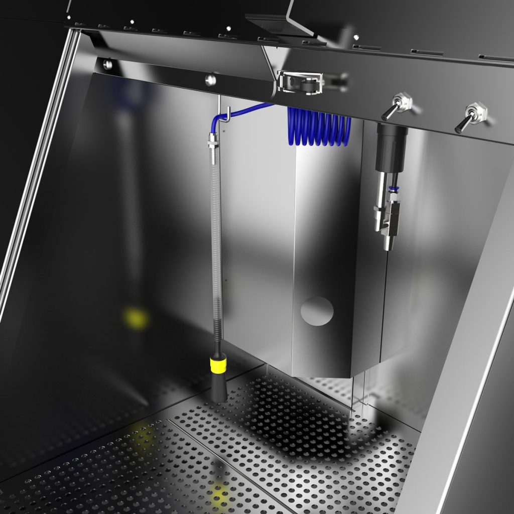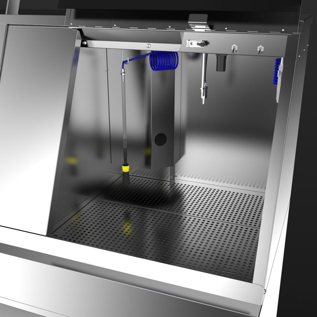 The manual cleaning area offers plenty of space, a pump-operated, pressure-adjustable brush, a fresh rinse nozzle for final cleaning and a blow-off gun for drying.