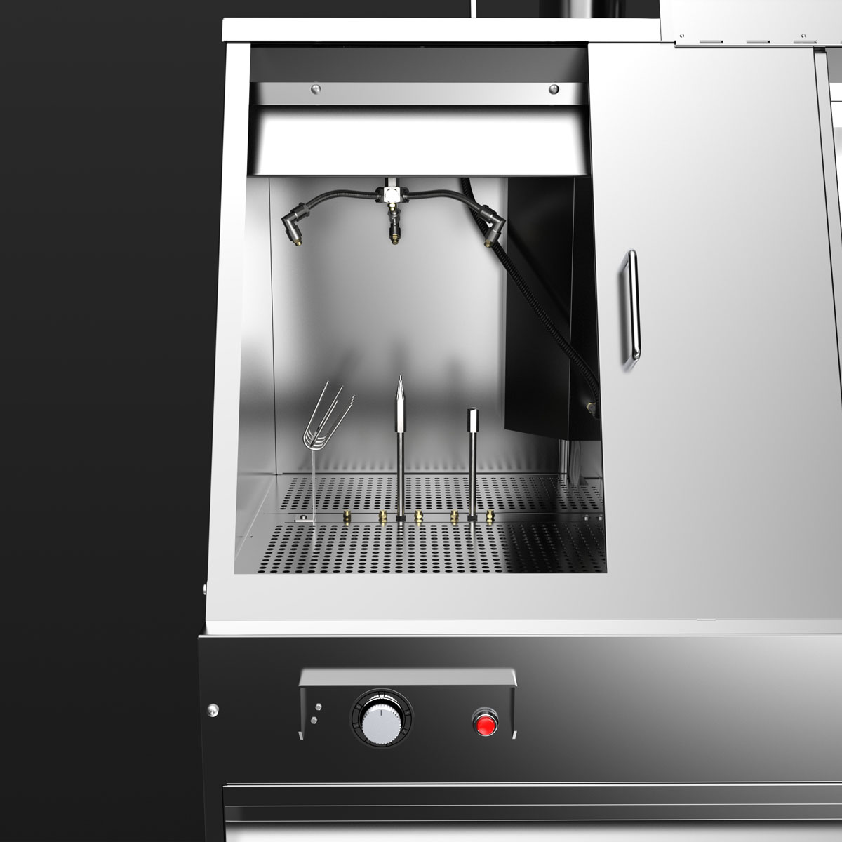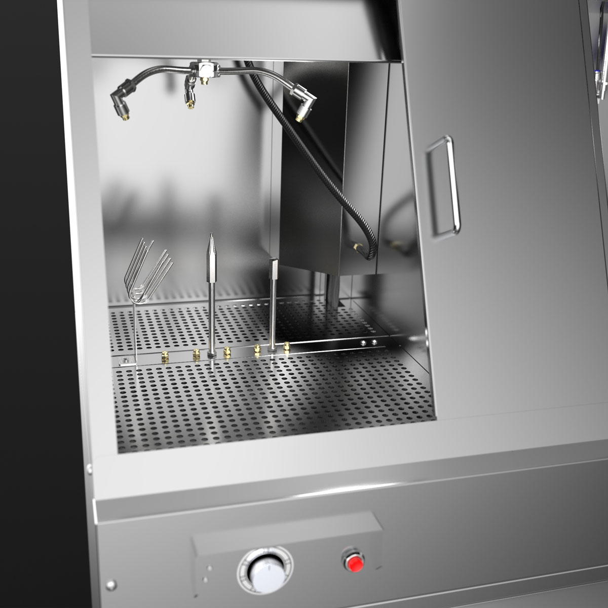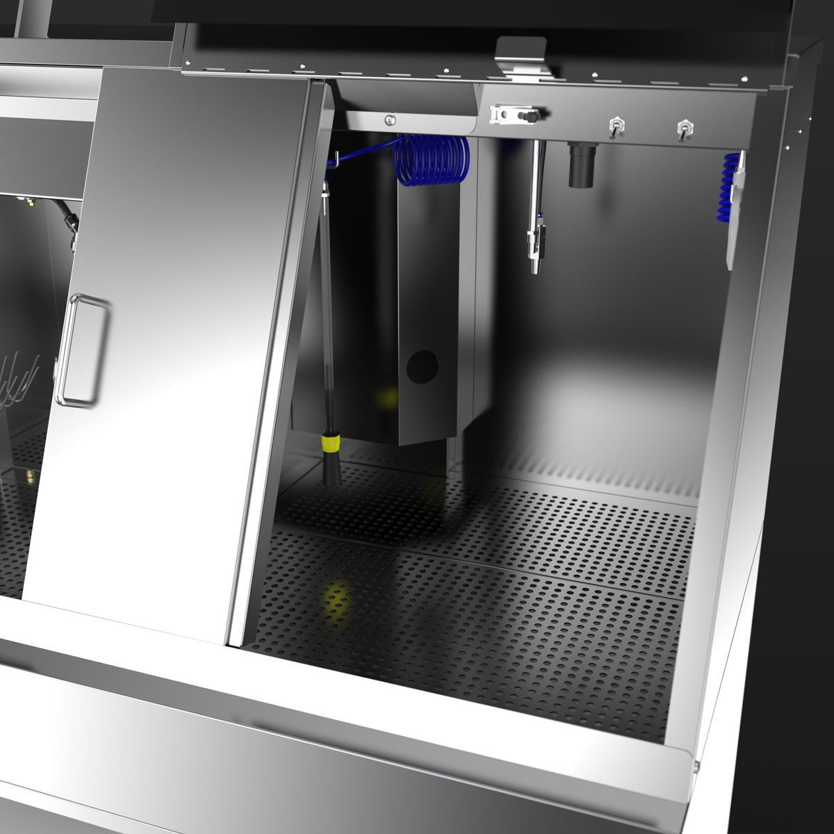 The manual cleaning area offers plenty of space, a pump-operated, pressure-adjustable brush, a fresh rinse nozzle for final cleaning and a blow-off gun for drying.