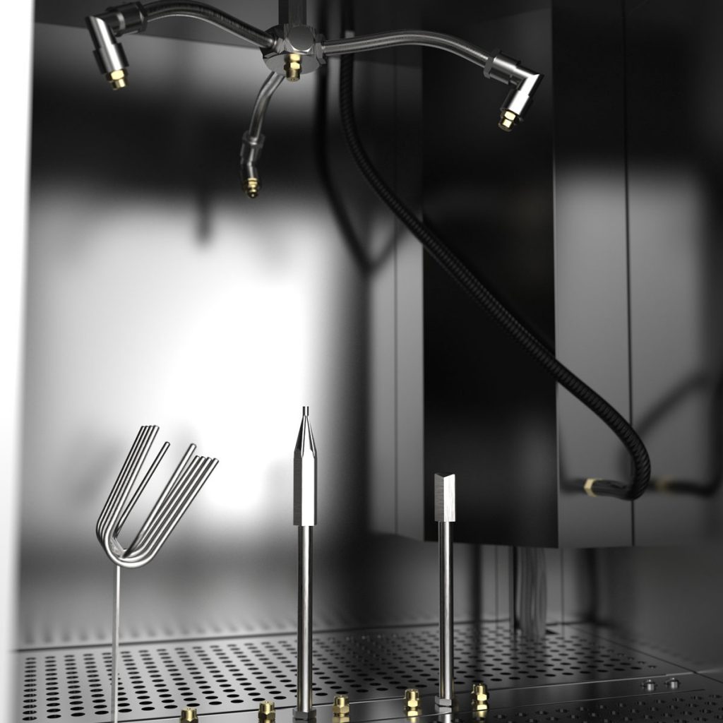 Opening of the spray / paint guns by a trigger clamp takes place inside the gun washer after the gun sits perfectly on the cleaning nozzle.