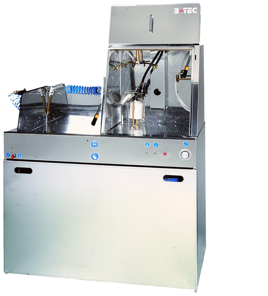 The left-hand side of the unit corresponds to the B-TEC w-800-1, a universal cleaning station for water-based paints with pneumatic mixing device (coagulation) for manual cleaning of parts or paint spray guns by using a brush and a water gun – perfect in combination with our B-TEC water-based paint cleaner H2O-RK.