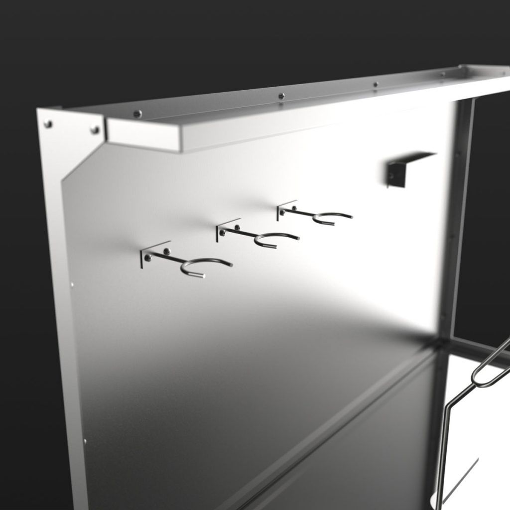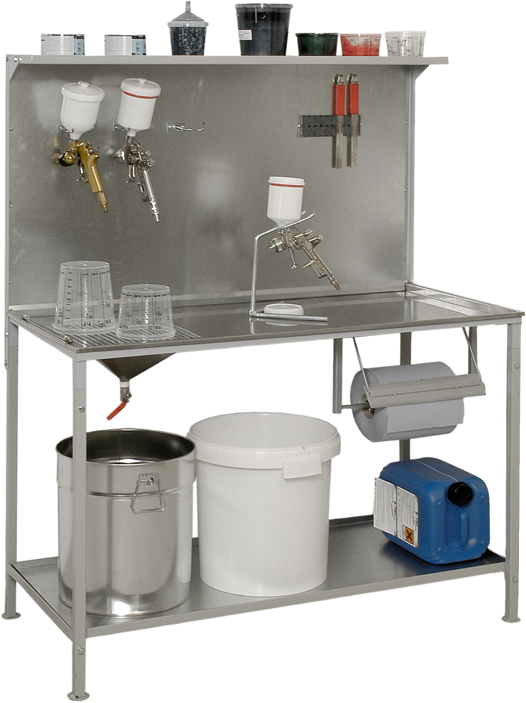 With the help of the drainage area, paint residues can be collected quickly and easily. With four gun holders and a powerful magnetic strip, every tool finds its place.