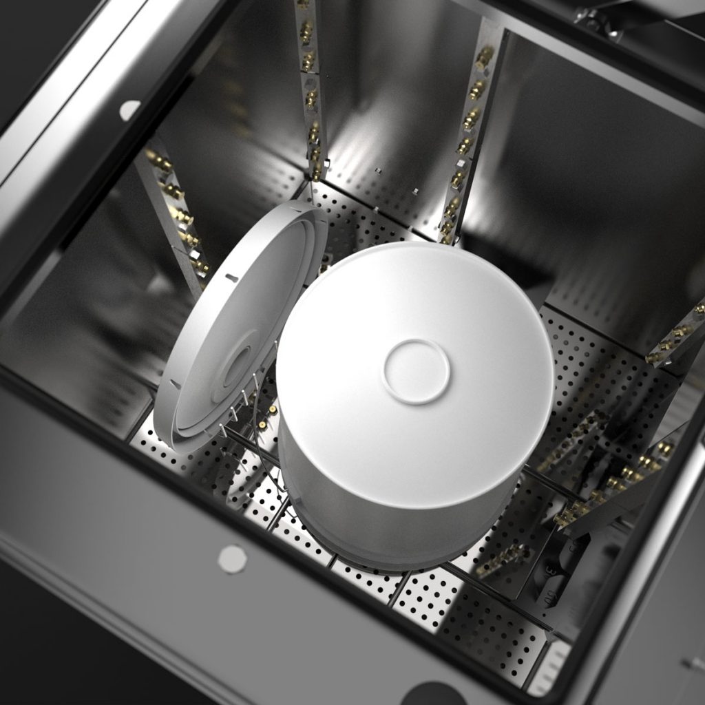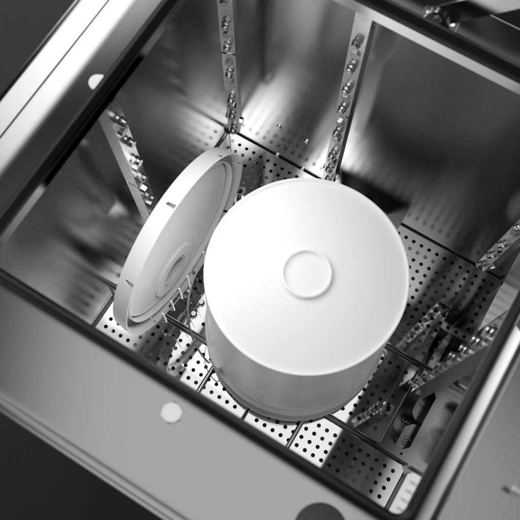 The RWR-800-H enables automatic cleaning of paint pails/hobbocks for reuse and/or disposal in the more economical recycling chain (depending on the material).
