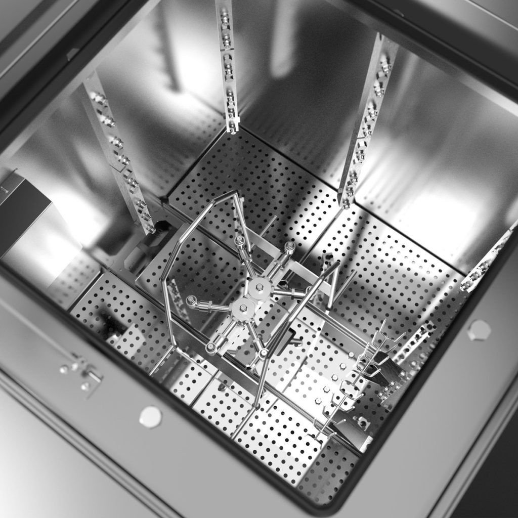 Bright cleaning chambers due to the utilization of stainless steel. No utilization of light absorbing plastic.