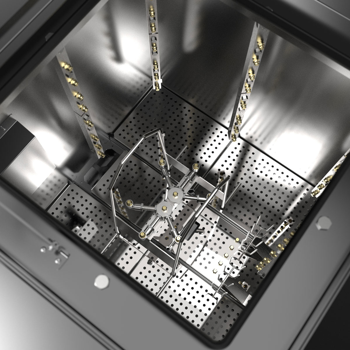 Bright cleaning chambers due to the utilization of stainless steel. No utilization of light absorbing plastic.