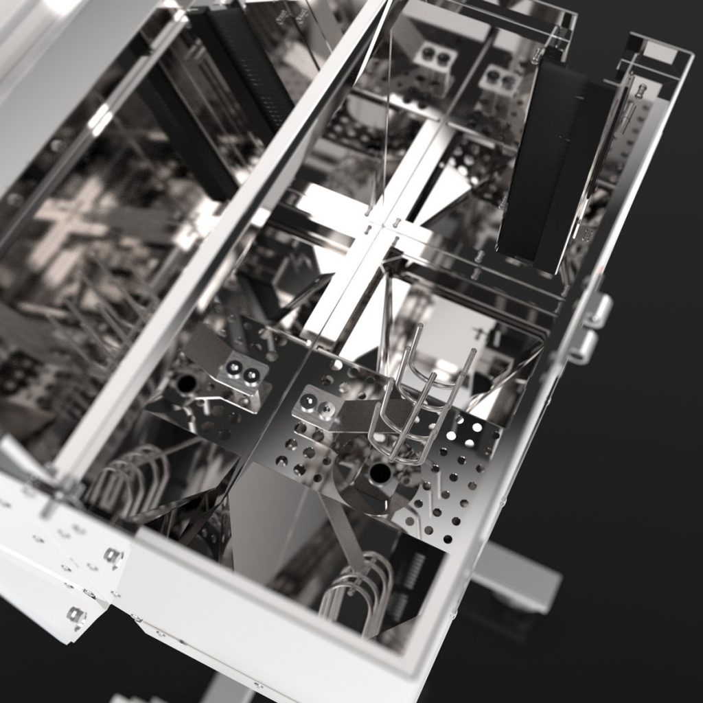 Bright cleaning chambers due to the utilization of stainless steel. No utilization of light absorbing plastic.