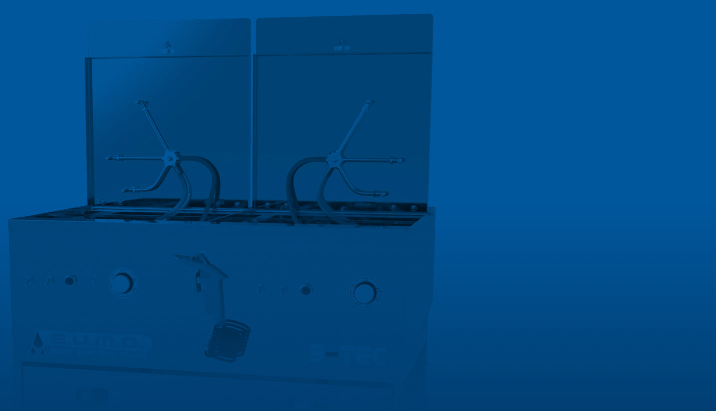 The basic module of the S.U.M.O. consists of two compact, independent cleaning rooms, includes the familiar powerful B-TEC extraction system for both sides of the machine and an universal blow-off gun.