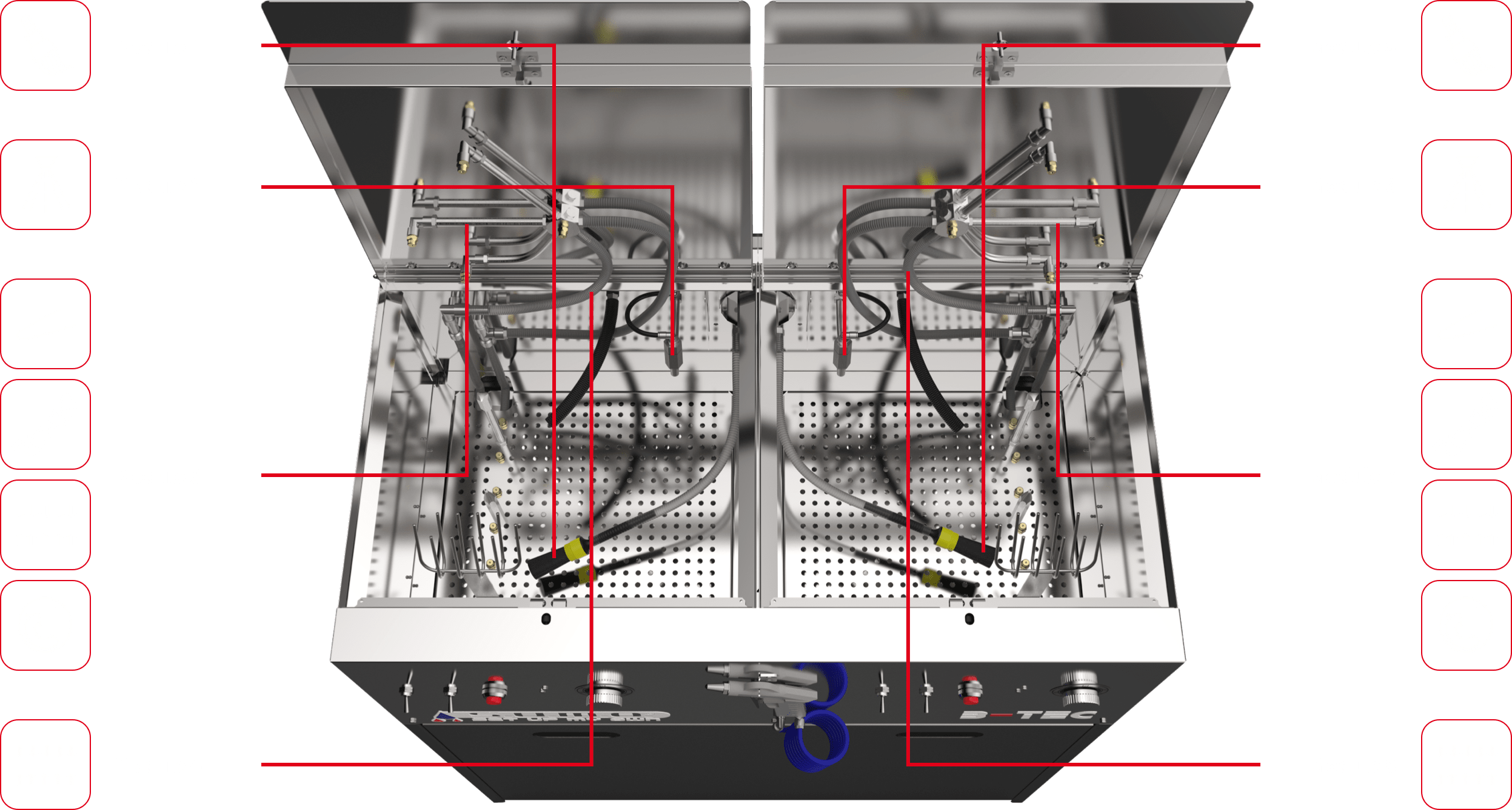 The washer is divided into two independent cleaning rooms, which can be used with solvent / B-TEC E2C, water-based cleaner or each with a different cleaning medium.