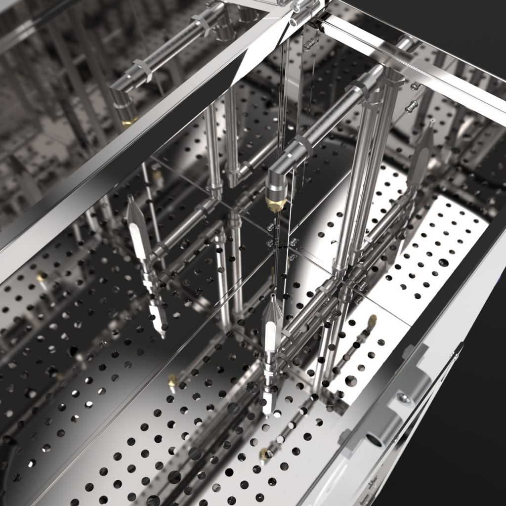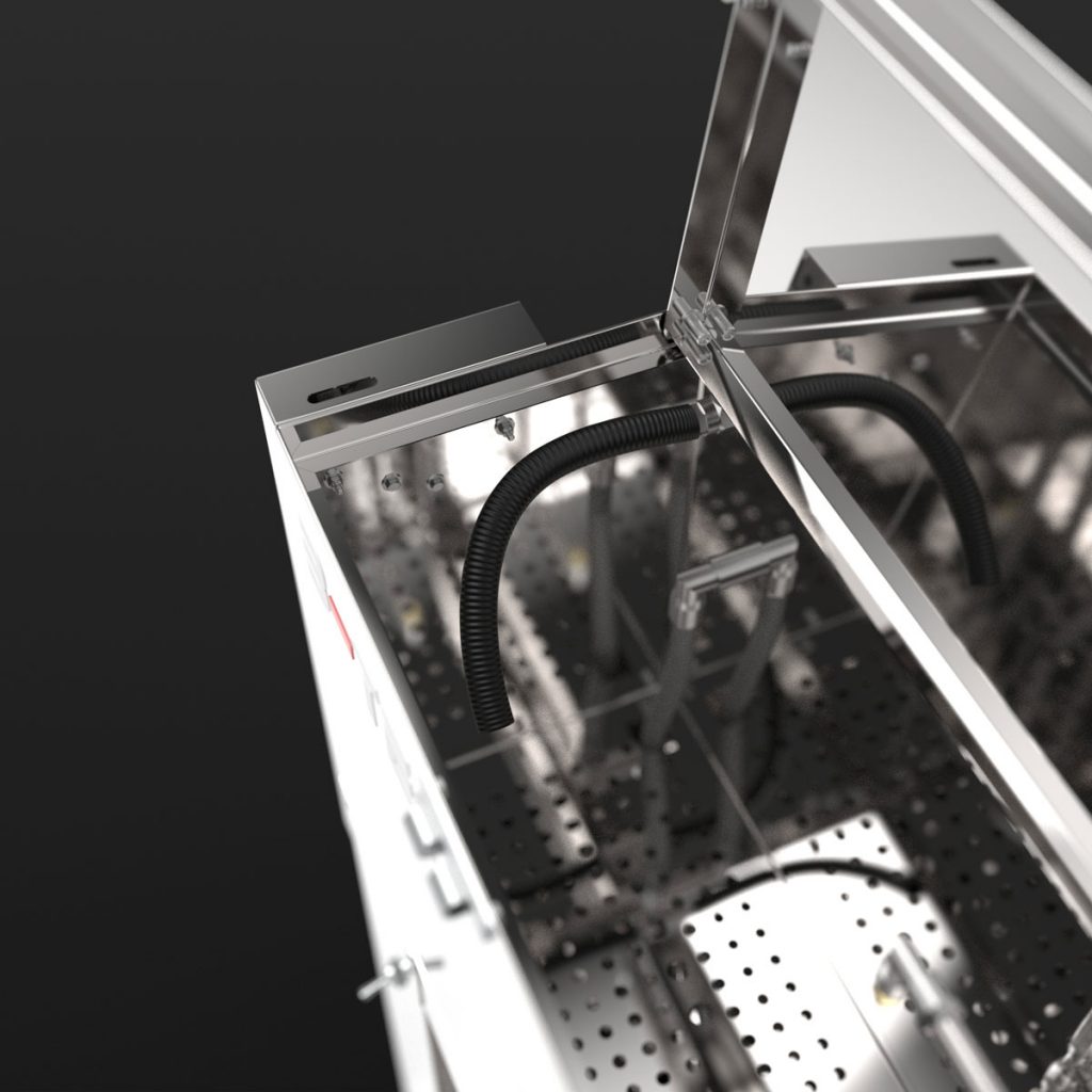 Bright cleaning chambers due to the utilization of stainless steel. No utilization of light absorbing plastic.