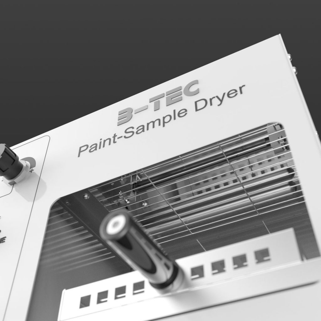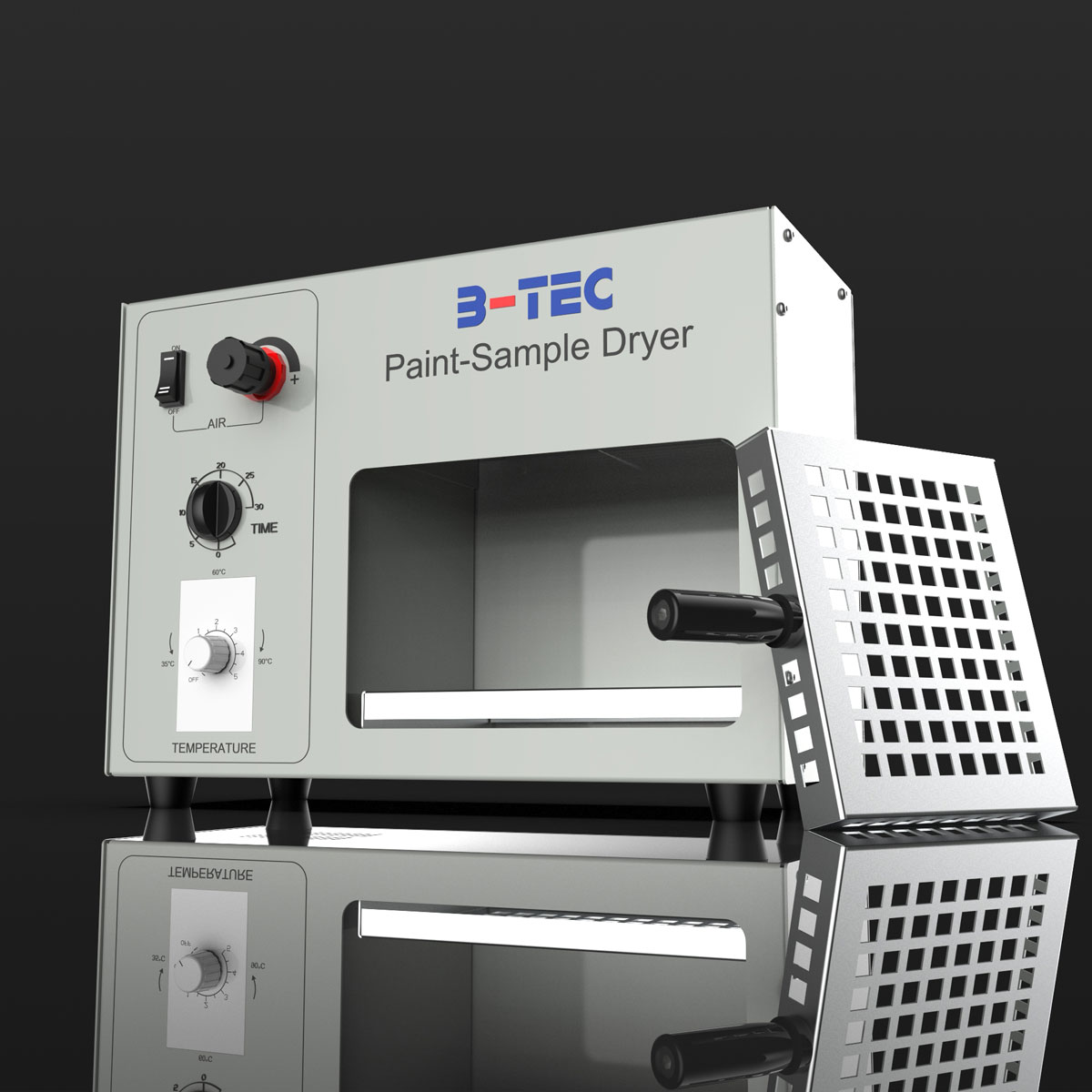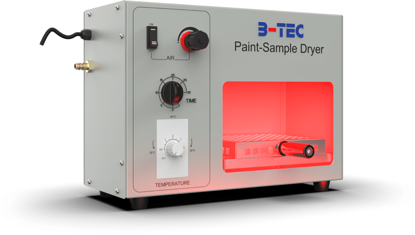Dryer for fast drying of water-based paint spray samples with infrared and compressed air.