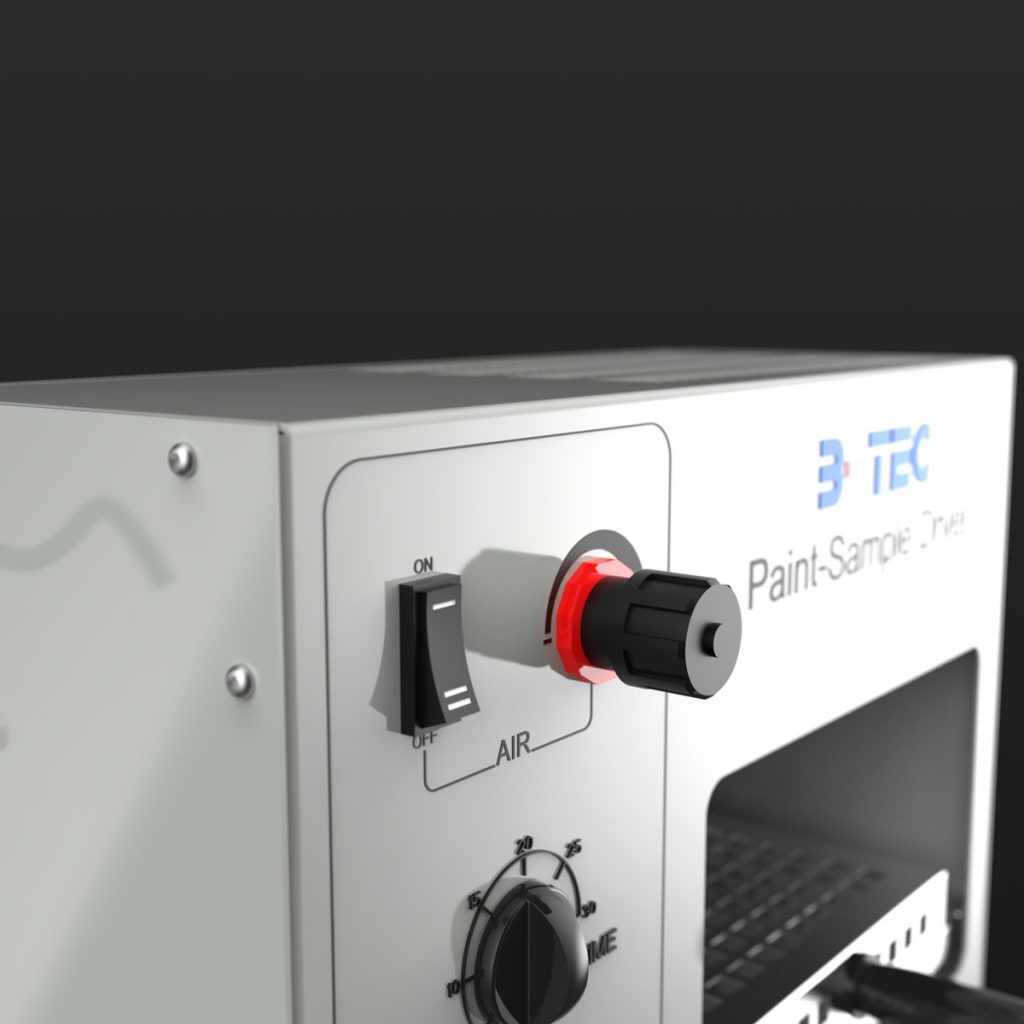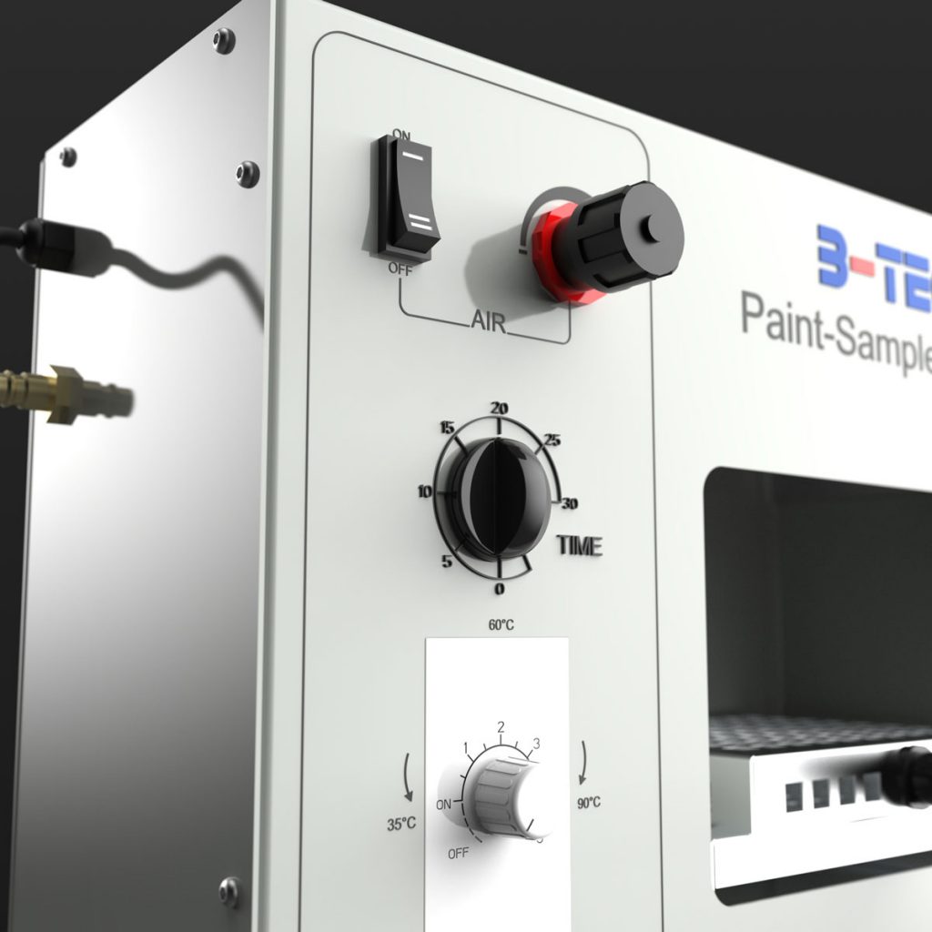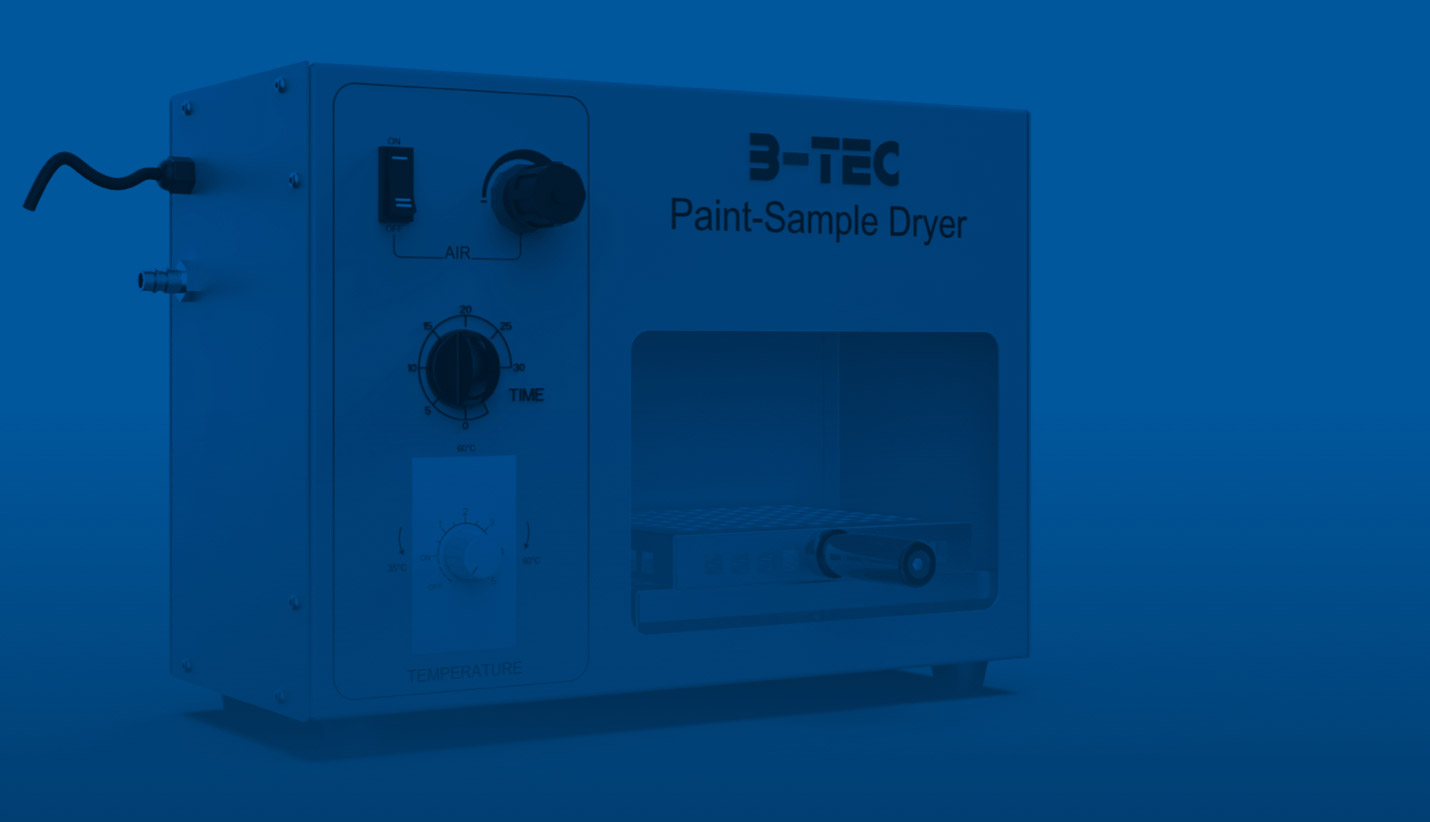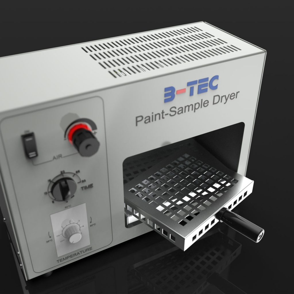 Dryer for fast drying of water-based paint spray samples with infrared and compressed air.