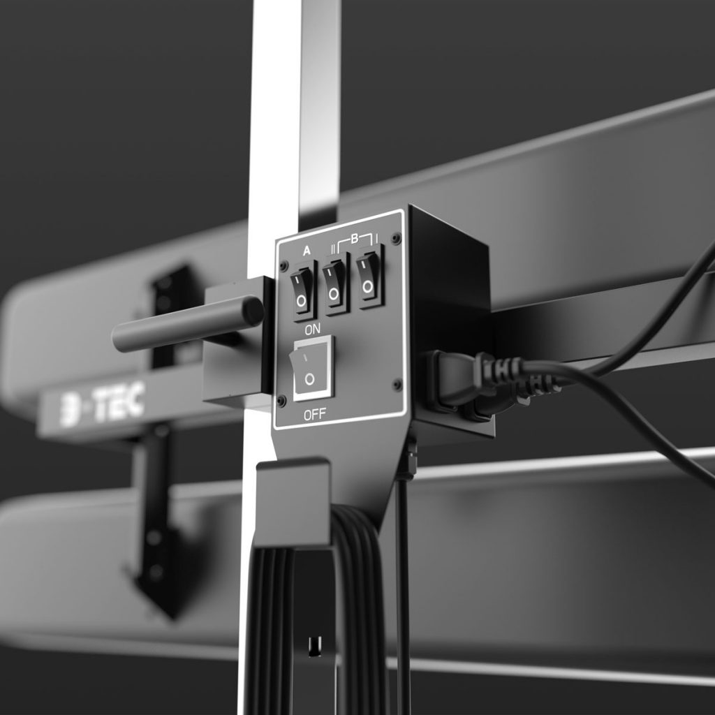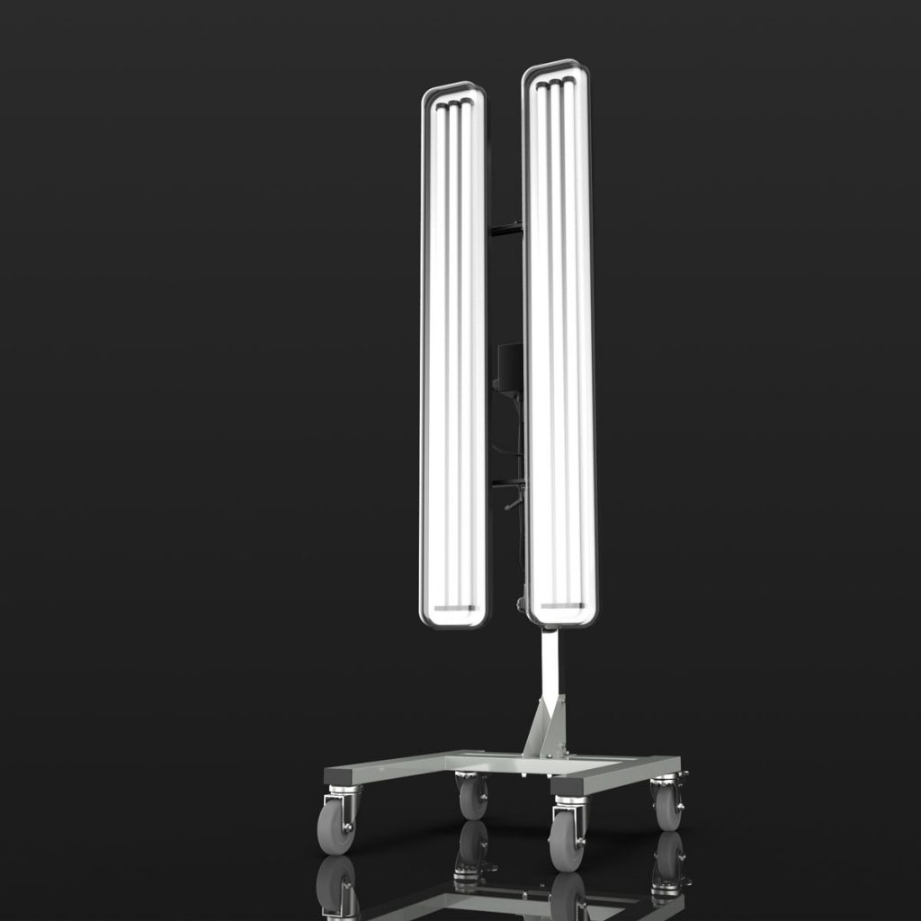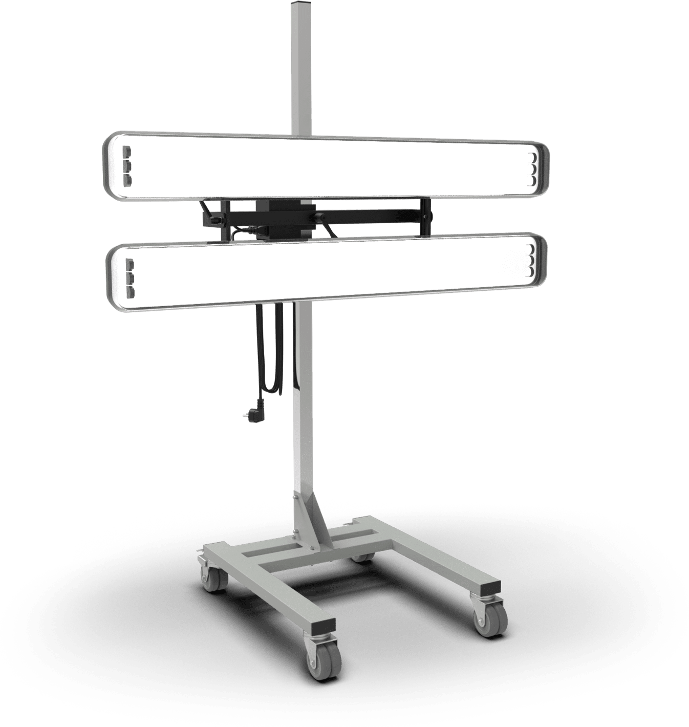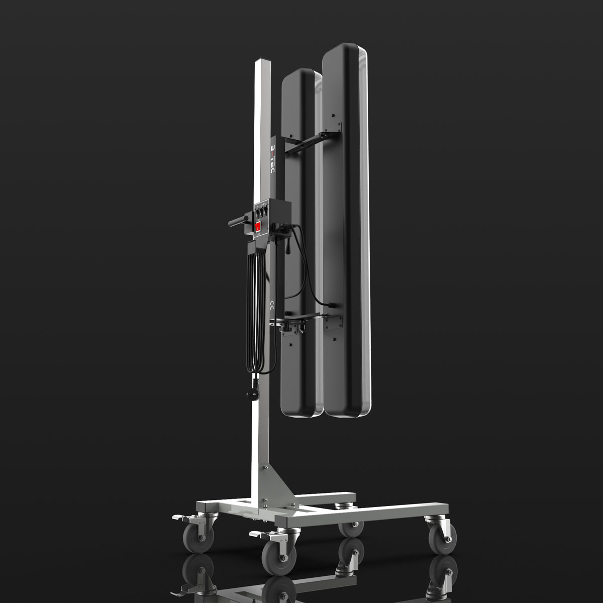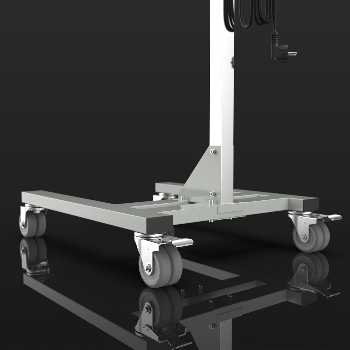 Due to the mobile stand with high-quality double rollers, moving over gratings is also possible without any problems and due to the adjustable lamp field, the Sunny-LED can be stored in a space-saving way.